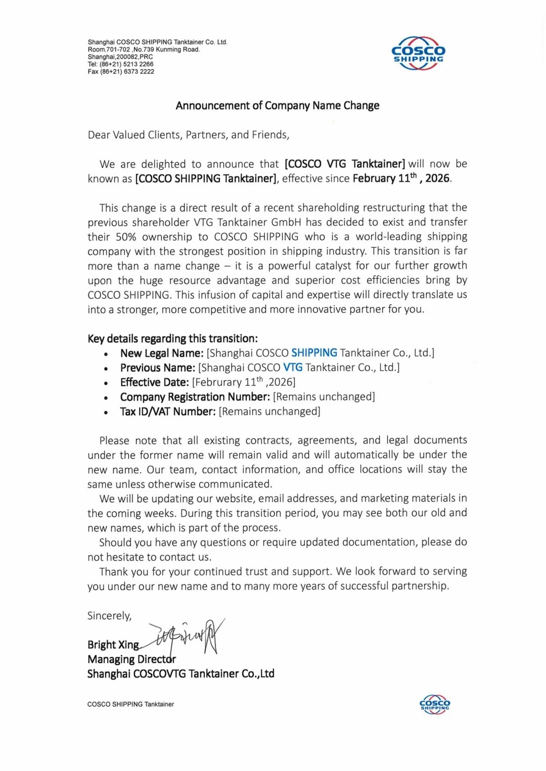 作为物流供应链与集运首个联合收购外资股权项目,本次交易严格遵循国有资产管理相关规定及跨境并购流程,最终达成物流供应链持股60%、集运持股40%的战略持股结构。交割完成后,公司正式由“上海中远海运罐箱物流有限公司”更名为“上海中远海运罐箱物流有限公司”,英文名称同步更新为:Shanghai COSCO SHIPPING Tanktainer Co.,Ltd)。